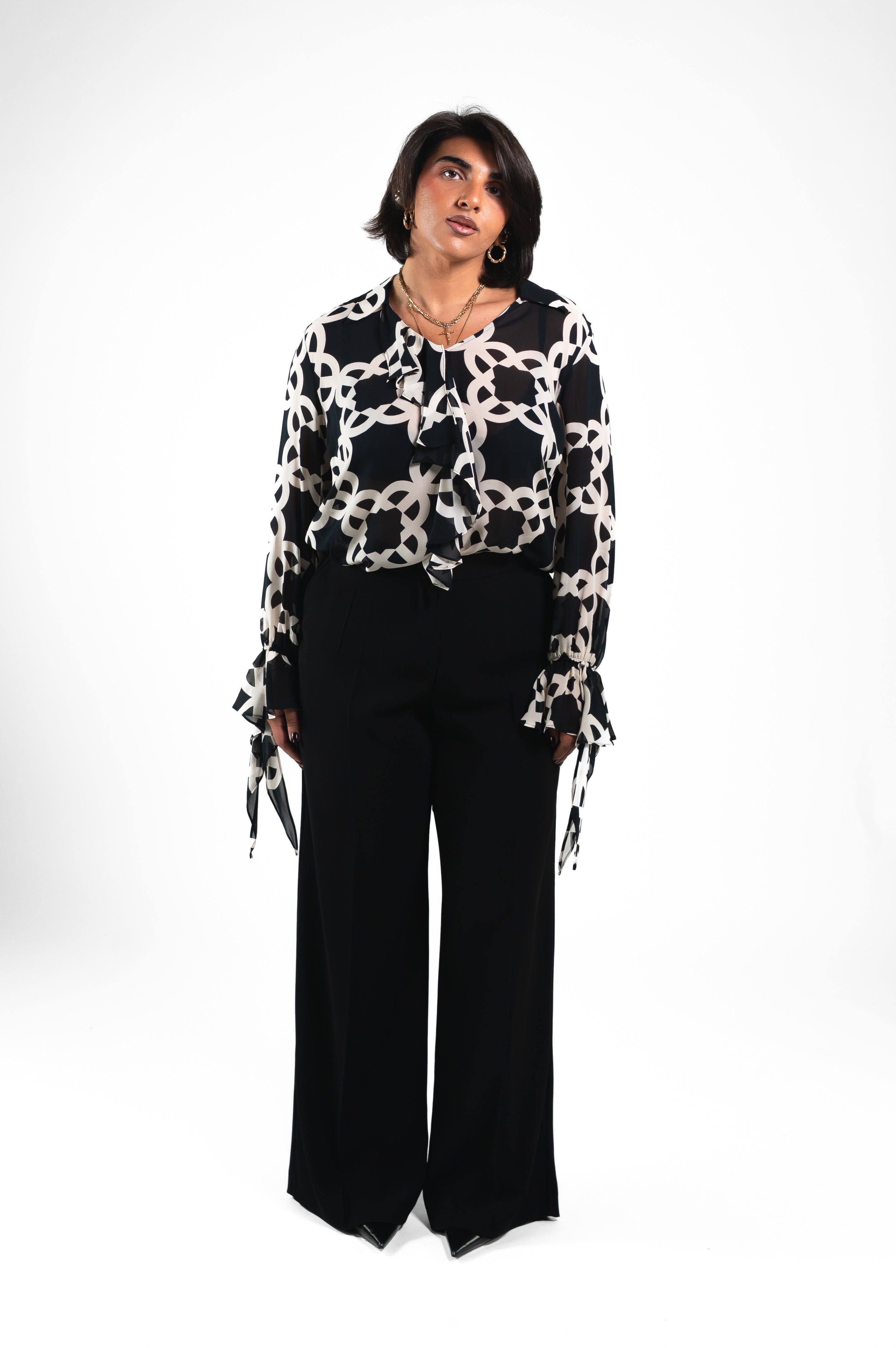 Blusa in georgette dalla stampa monogram, con jabot davanti e volants ai polsi con scollatura a v