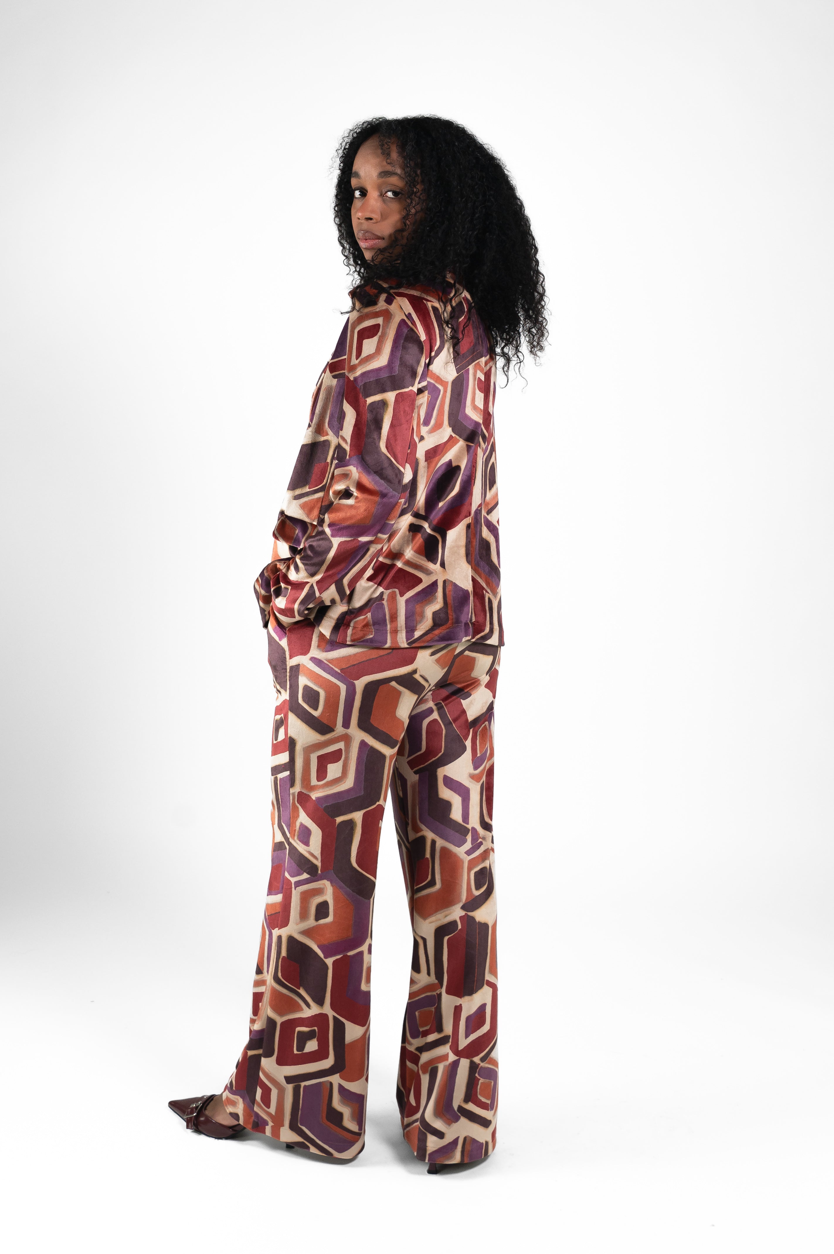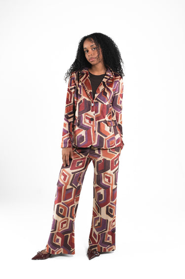 Tailleur in ciniglia fantasia geometrica con pantalone gamba larga