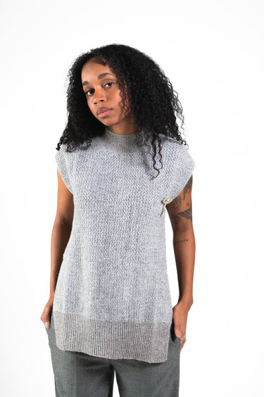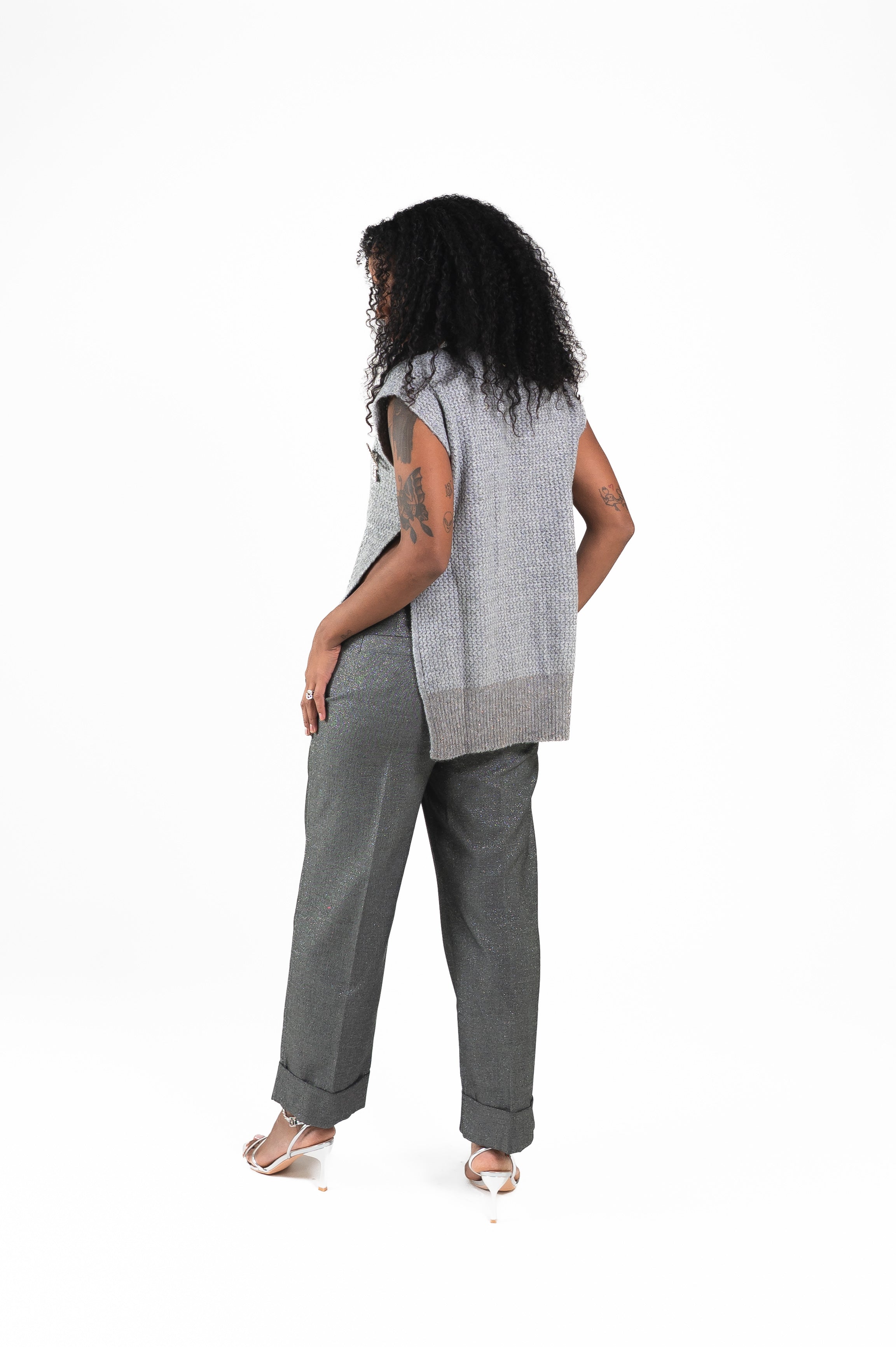 Maglia smanicata in tessuto lurex con spacchi laterali e spilla applicata